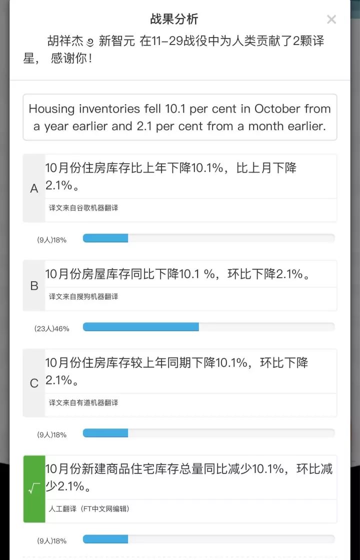 小编也坏着忐忑的心情参与了一次PK,结果为人类军团添加了两颗星(还行吧),大家可以在下面的截图中感受一下现在的机器翻译究竟有多强大。