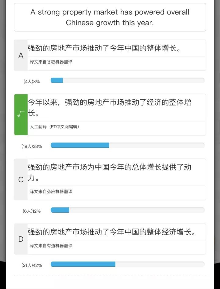 最近,我们注意到,有一个叫做“试译宝”的微信公众号发布了一个机器翻译人机PK:具体规则是给出三道题,每道题包含对一句话的四个版本的翻译(其中有一个答案是人类译员给出),参与者需要从这四个选项中选出一个自己认为最可能是人类译员提供的答案,选对了为人类加一颗星,选错了机器加一颗星。