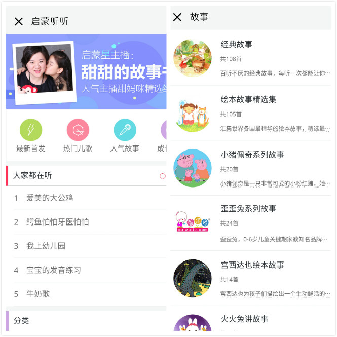 除了讲故事,也有英文、国学、儿歌、百科等内容,以及面向妈妈的亲子陪伴方法,育儿理念等内容。