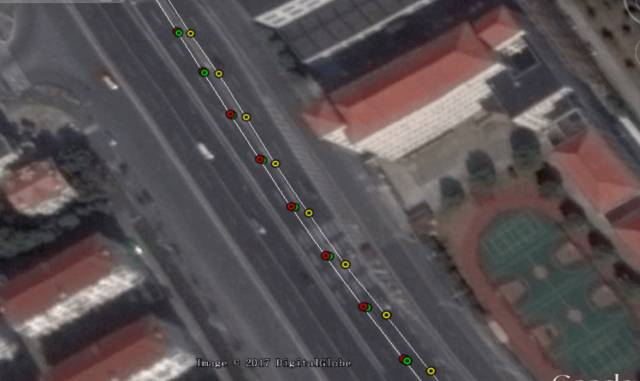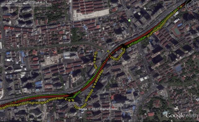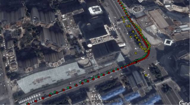 在其官网的测试对比中,我们可以看出相比于 GPS,千寻定位更加准确,红色圆点为真实位置,绿色圆点为千寻定位服务,黄色圆点为对比手机: