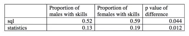 大体上,我们可以说在技能的大多数方面男女之间不存在差异,而SQL和统计上又是女性有显著的优势。