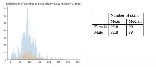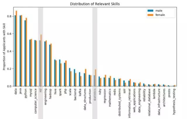 通过定性分析,我们可以看出技能分布在男女求职者上区别不大。