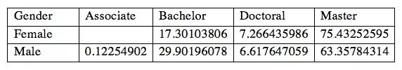 下表列出了求职者最高学历的分布情况(百分比),职位的要求是理工科本科或者硕士毕业生。