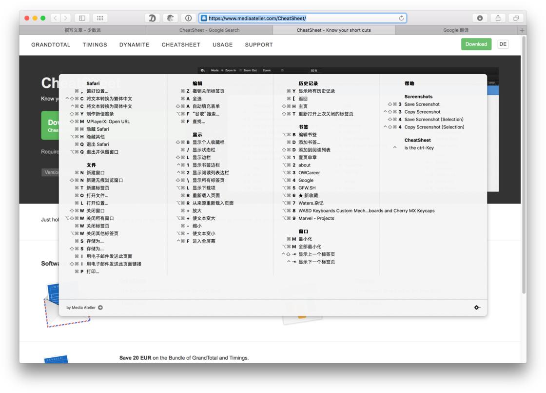 同样的,小明继续用聚焦搜索的方式快速打开了微信、Telegram 等一系列软件来查看工作信息。打开这些 App 之后,突然发现自己并不知道软件自己的快捷键设定,想起原来安装的第一批的软件里有一个叫 CheatSheet 的软件,于是默默的长按住了 Command 一会软件的所有快捷就出来了。