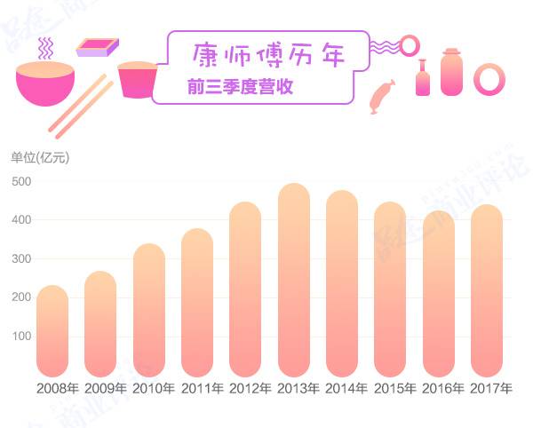 根据方便面协会的统计,2011-2013年,中国方便面年销量从424.7亿包增长至462.2亿包,但这种稳定增长的趋势在2013年发生转折,2013-2016年,方便面年销量从462.2亿包跌至385.2亿包,跌幅高达16.66%。这种由盛及衰的倒“V”字型发展历程,在国内的主要方便面企业更加明显。