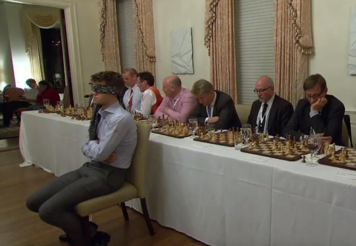 被蒙住眼睛的Carlsen VS 哈佛象棋手