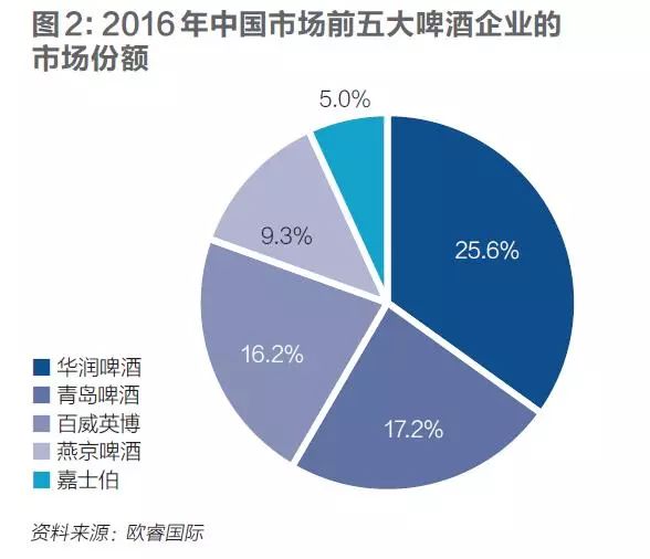 根据欧睿国际统计,2016年中国啤酒行业前五名的市场份额之和是73.3 %,前三名分别是华润啤酒、青岛啤酒、百威英博。