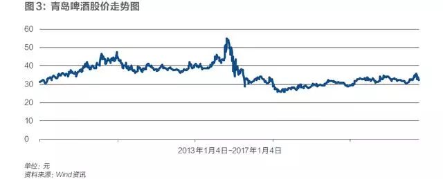 2014年,中国啤酒行业进入下行通道。随后两年,青岛啤酒市场份额下降0. 8 %,而华润啤酒、百威英博却各自逆势增长2.0%、1.9%。
