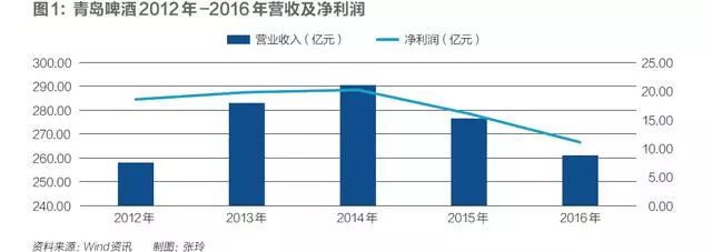 市场份额的下降的同时,2015年-2016年,青岛啤酒的营收分别同比下降4.87 %、5.53 %,净利润分别同比下降13.92 %、39.09 %。