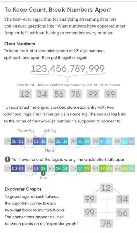 在接下来的 30 多年中,Cormode 和其他计算机科学家改进了 Gries 和 Misra 的算法。例如,一些新算法能够检测趋势词条,而另一些则能够对词条频繁出现的含义进行更细致的定义。所有这些算法都做出了权衡,比如牺牲速度来提高准确性或者加大内存消耗来增强可靠性。