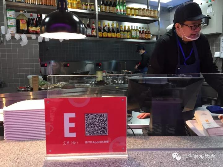 卖场结构可以理解为是三个圆圈嵌套的结果。三圈造型,内芯是海鲜货架,放在中间有景观考虑,中间圈是桌椅就餐区,外围靠墙是7个烹饪档口,有悬挂链,不是为了送外卖,是为了内芯海鲜区和厨房的生熟联动。虽然档口的形状有点像大食代,但是食材却不可同日而语。7个现做现吃厨房档口,有不同烹饪方式区别,其中两个(炒菜,蒸菜)与中心区海鲜货架联动,可做海鲜。其余档口的食材(铁板烤肉、麻辣烫…)都是把食材放后厨。两个档口(日式寿司)是现做现吃,其余都是现点现做现吃。所以档口柜台有二维码点餐,档口上方有电视屏显示加工时间和叫号取餐。