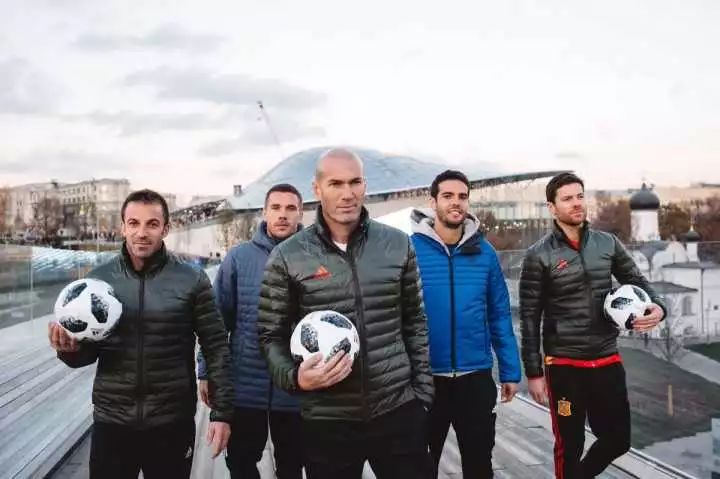 Telstar 18发布仪式上,阿迪达斯邀请齐达内、卡卡、皮耶罗、哈维·阿隆索和波多尔斯基这 五位1998-2014年世界杯冠军队成员助阵,可谓诚意满满