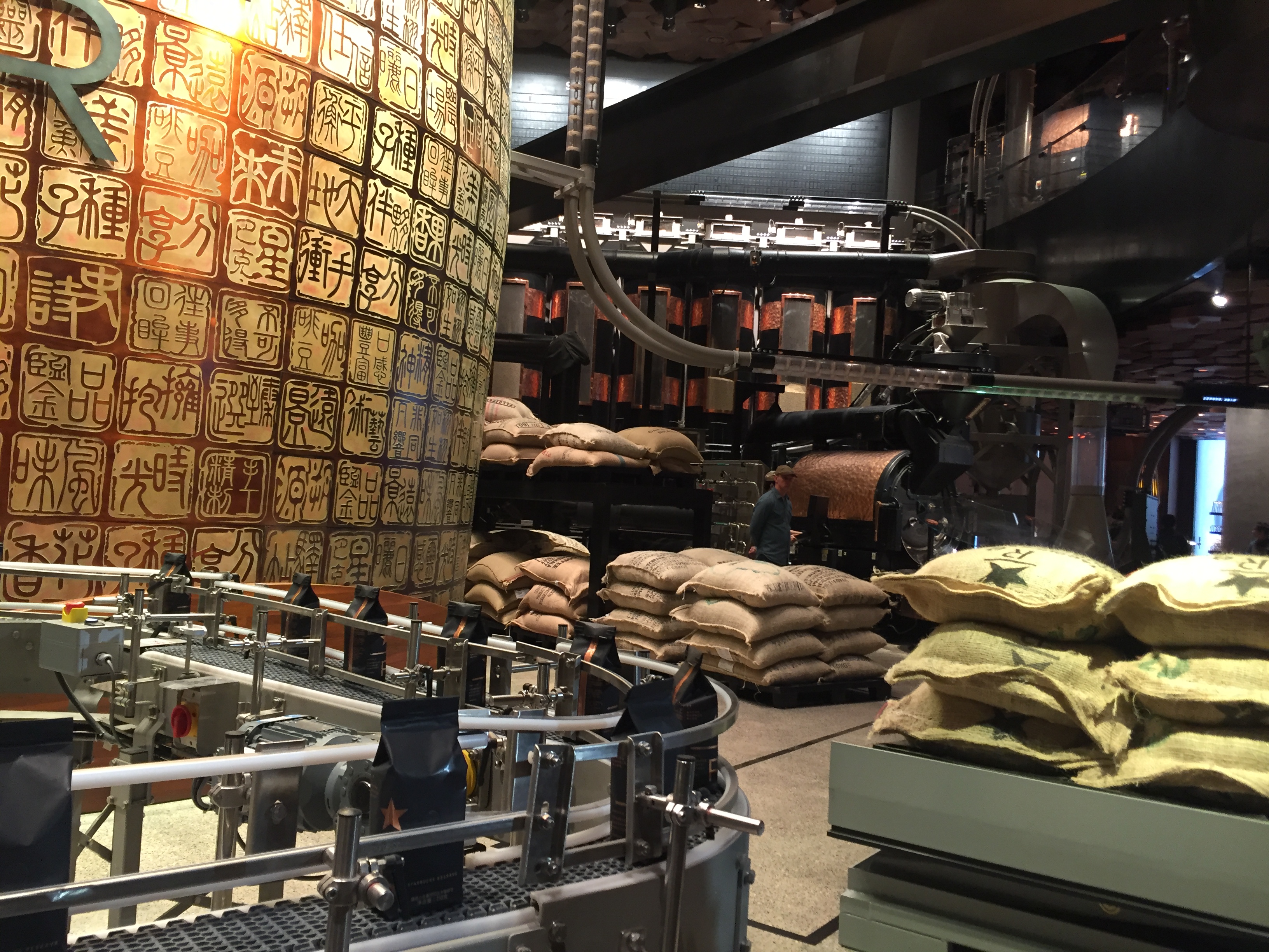 星巴克不仅把它作为一间旗舰店,而且也要做一间咖啡烘焙工厂,让每一个顾客看到一颗颗绿色的生豆,如何经历工业化的烘焙与艺术化的充煮,直至成为杯中的饮料。