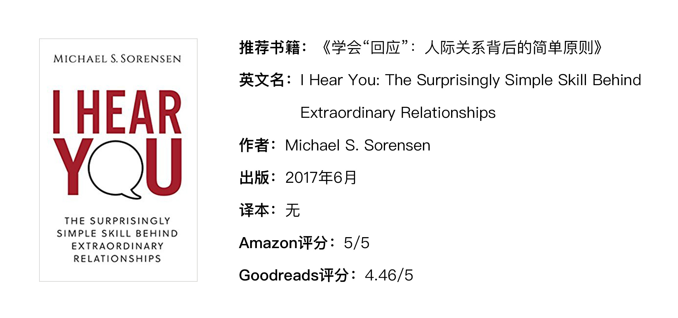 迈克尔·索伦森(Michael S. Sorensen)是美国知名的心理研究员和咨询师,在他的新书《学会“回应”:人际关系背后的简单原则(I Hear You)》告诉我们,那些人际关系链的顶端人群都有一个共同的简单原则:正向确认(Validation)。他告诉我们,真正的耐心,是去弄清楚“故事”的原委,去抓住对方真正的需求。