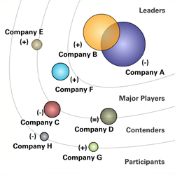 市场竞争格局分析——展示竞争格局以及你在市场上的位置。展示解决方案和鸿沟的位置,以及你是如何填补这个鸿沟的。