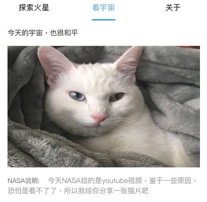 除此之外,「看看火星」还 看宇宙 功能,它能显示每天 NASA 选出的最美宇宙图,并且附带 NASA 的英文说明。有趣的是,昨日NASA 推荐的是 Youtube 视频,由于众所周知的原因,并不能正常播放,这时开发者则为用户献上了猫片。