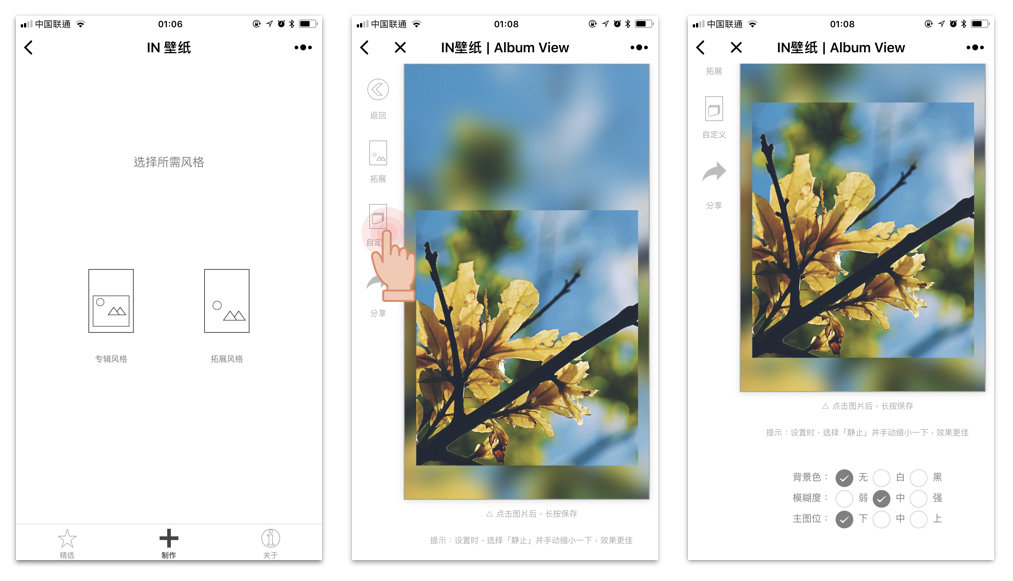 在「制作」中,你可以在不裁剪原图的前提下,把比例不合适的图片变成适配手机锁屏的壁纸。IN 壁纸提供了两种风格: