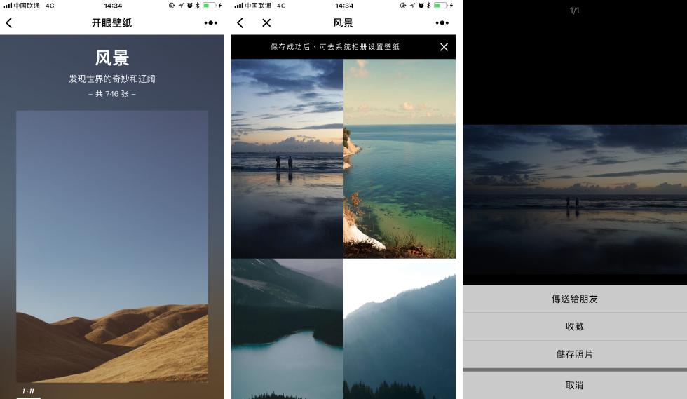 每日精挑细选 5-10 条优质短视频的开眼视频想必大家都有所了解,开眼壁纸就是其开发的一款壁纸类小程序。小程序的内容是由设计师精心挑选的海量高清高品质壁纸,共有 11 个类别:风景、星空、建筑、运动、美食、纹理、生活、艺术、萌宠、植物以及汽车。种类非常丰富,每个类别所拥有的数量也非常可观。
