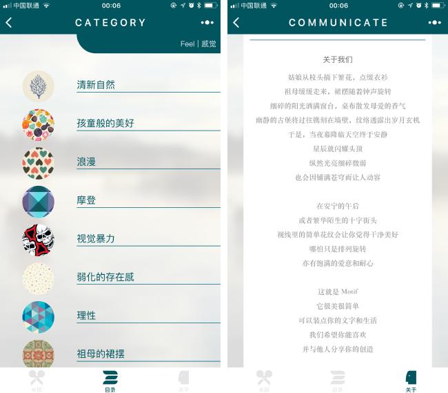 如果觉得时间线寻找图案过于繁琐,你也可点击「目录」,按分类查找:感觉、元素、颜色、纪念。在「关于」界面中的介绍也非常文艺,如果有时间不妨读一读,更好的了解 MOTIF 和它背后的三个人。