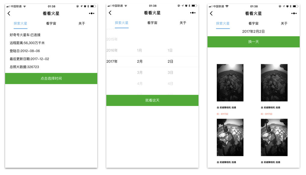 「看看火星」利用 NASA 接口,实现可按日期查询好奇号火星车登上火星至今拍下的所有照片。仅仅一天,就能够显示 196 张,里面的图片由前避障相机、桅杆摄影机、化学照相机、透镜成像仪、导航相机等多个角度拍摄。不过略显遗憾的是图片并不能实现原图预览,须保存图片后才能查看原图。