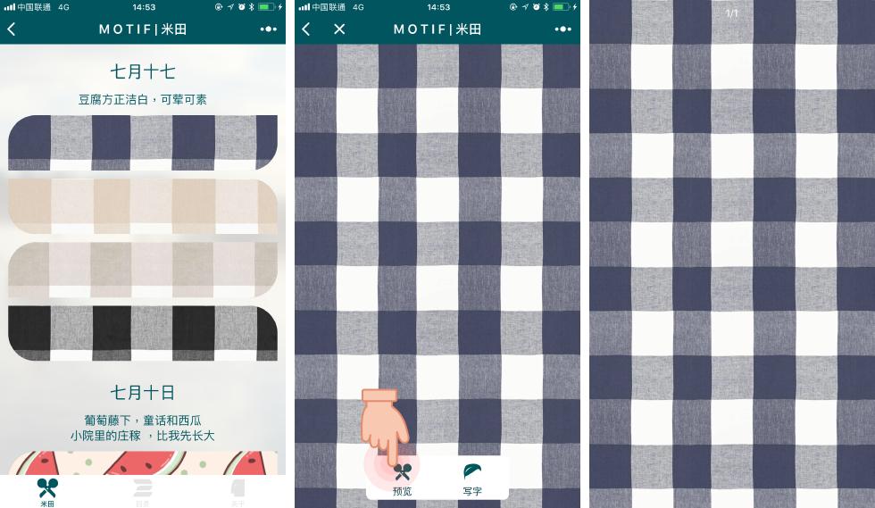 MOTIF 里都是传统图案和四方连续,它将这些图案变成了壁纸。进入小程序时,会首先进入到图案更新的时间线中,绝大多数更新都有带有文艺味道的文字说明。打开图案后点击预览即可全屏显示,长按即可保存。