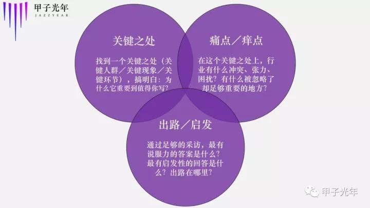 你的整个采访过程,便是刨根问底把三个圈分别画清楚的过程;你的整个写作过程,便是带领读者抵达这三个圈交集的过程。