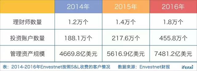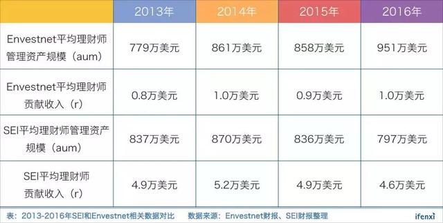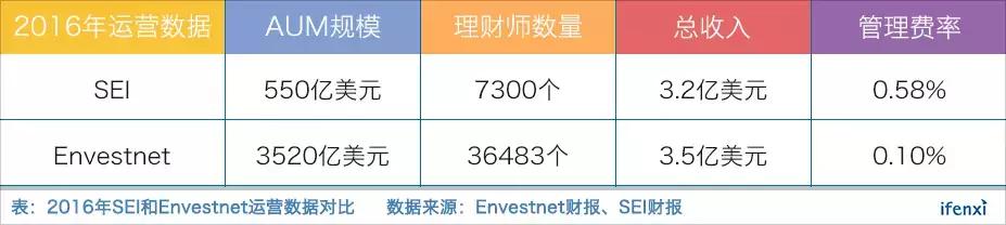 2016年SEI针对理财师的业务板块,其AUM管理资产规模达到550亿美元,合作理财师7300个。相比之下,Envestnet的AUM规模3520亿美元,理财师数量3.6万个,基本上都是前者的5-7倍,但是两家最终的收入几乎是一样的。