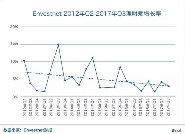 与此同时,我们关注过去22个季度Envestnet上理财师数量的增长情况,排除不同季度波动和受到兼并收购、战略合作影响外,其理财师的原生增长趋势是在缓慢递减的。