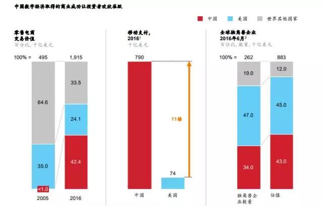 中国有全球最大的电子商务市场,占据了全球零售电商40%以上的交易额;在自动驾驶汽车、3D打印、机器人、无人机和人工智能等领域,风险投资规模位列全球三甲;全世界1/3的独角兽企业(估值超过10亿美元的创业公司)都来自中国;中国科技企业的运算效率保持着世界纪录。