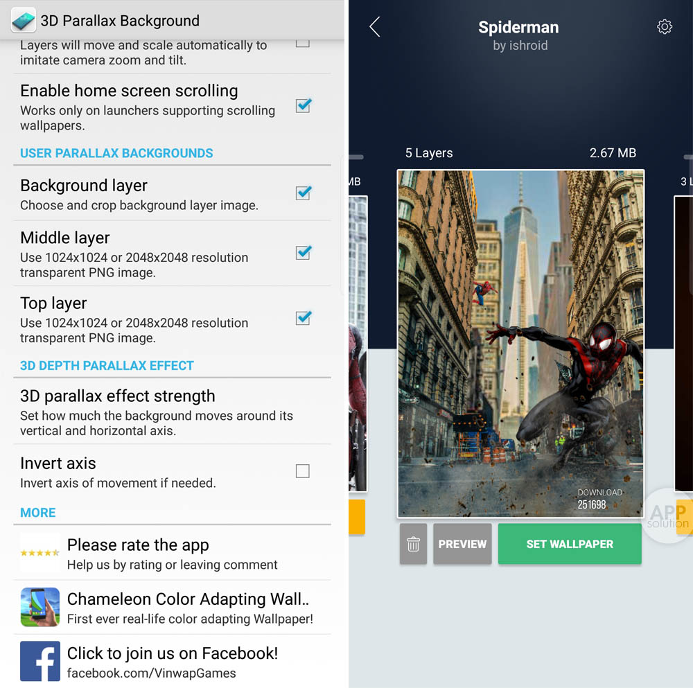 推荐应用 「3D Parallax Background」,不过它是付费的。如果只是想要体验这种类型的壁纸,可以下载免费的「3D Wallpaper Parallax 2017」,壁纸库更为丰富,也有许多高质量的作品,只是少了几个自定义选项,不能对多图层进行选择。