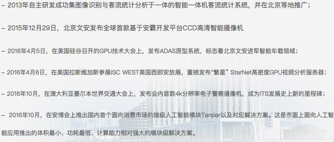文安智能创立于2005年,主要为垂直行业提供量身定制的AI产品及解决方案,业务主要聚焦智慧城市和商业智能两大行业。2012年发布全球首款交通智能一体机,2013年发布全球体积最小的客流统计智能机、2015年发布了全球首款4K人脸智能一体机,2016年发布“繁星”高密度视频分析集群,2017年发布全球首款4K“16合一”多功能电子警察智能相机。
