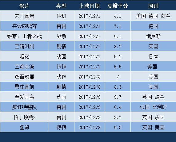 进入12月,多数批片所收获的成绩同样不容乐观。由《你的名字》原班人马打造的同类型日本动画《烟花》一周下来仅收获7500万票房,在排片降至5%以下的情况下,影片最终成绩可能只有《你的名字》的一个零头;施瓦辛格主演的《空难余波》上映一周票房不足100万,俄罗斯年度票房最高作品《维京:王者之战》和德国贺岁档票房冠军《夺金四贱客》也分别只收获了1300万和300万票房;《至暗时刻》目前的票房定格在2600万,随着排片也降至5%以下,总票房想要更进一步的难度不小。