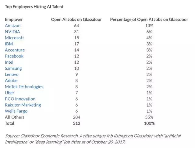 以上这些见解都来自 Glassdoor Research 的一项研究“Who's Hiring AI Talent in America?”,作者是 Glassdoor 首席经济学家 Andrew Chamberlain 博士。作为一家为职场人士提供企业点评和职位搜索的社区网站,Glassdoor 发布了 2018 年最佳雇主排行榜,为接下来想在人工智能领域找工作的人才提供了参考价值。