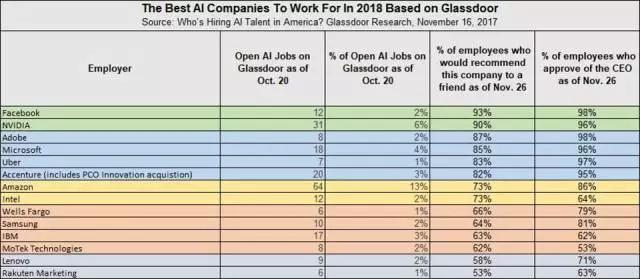 Facebook、NVIDIA、Adobe、微软、Uber 和埃森哲是 2018 年最佳的五家人工智能公司。在 Glassdoor 网站上,这五家公司就已经公布了 96 个新的 AI 职位,占到网站总发布职位的 18.7%。