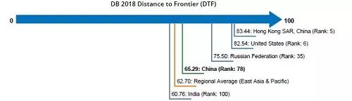 在这几个方面,中美的对比如下图所示,在世界银行统计的190余个国际与地区中,中国大陆的经营环境友好度(Ease of doing business)排名第78,美国排名第6,另外,香港排名第5。其中DTF(Distance to Frontier)为一测量尺寸,用来衡量各项指标的表现,DTF数值越高,表明企业经营越便利。