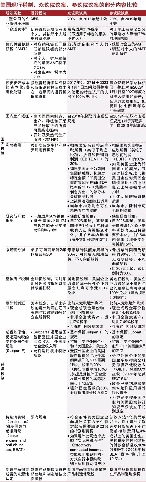 参议院法案和众议院法案的几项提案可能会对中国企业赴美投资产生相关影响。以下则是与美国联邦企业所得税相关的一些税改草案摘要(涉及穿透实体、免税实体,以及个人的税务在此不讨论):