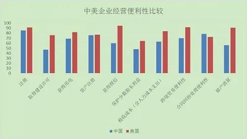 具体,在每个方面中美的具体表现情况如下。从下图中可以看出,除在合同纠纷处理方面领先以外,在中国经营相较于美国便利性都有差距,其中差距比较大的是建设许可,获取授信、税收成本以及破产清算等。