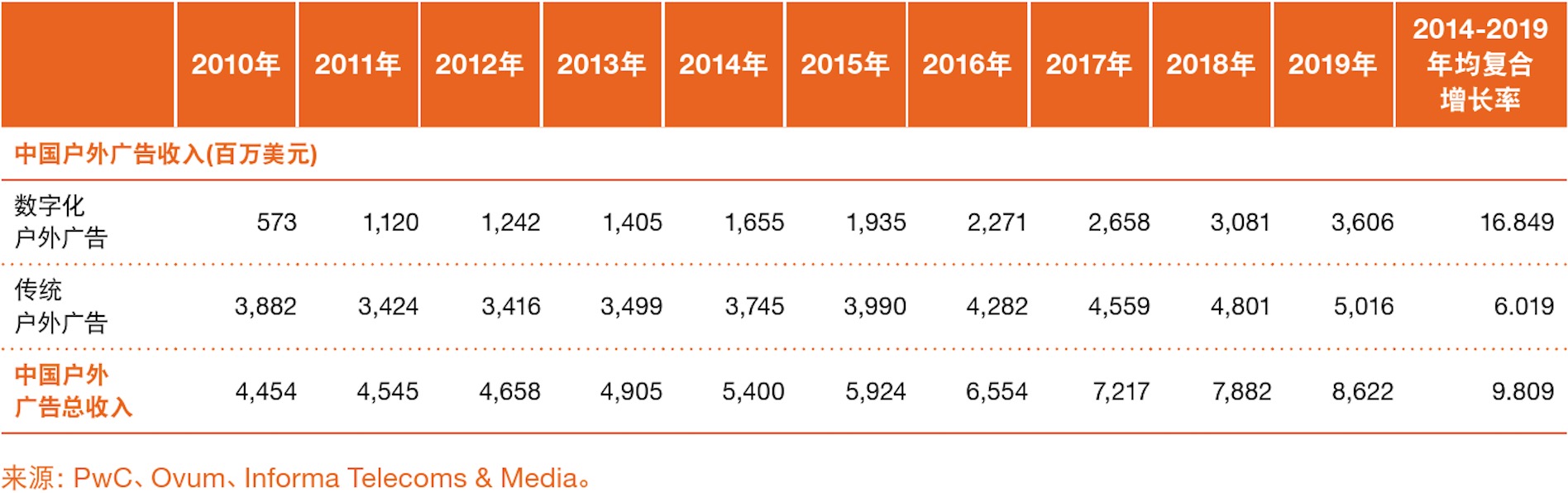 最初的户外广告可以追溯到九十年代末,发展到现在户外广告形式也越来越丰富。广告形式从单一的立牌展示,发展到现在出现了更多的新型户外媒体,比如机场广告、候车亭广告、地铁广告、公交车身广告、电梯广告、高立柱广告、楼顶广告、霓虹灯广告、墙体广告、LED显示屏等。不过2010年开始,互联网的迅速发展出似乎占据了大多数人的心智,户外广告在那段时间似乎并没有激起太多水花。但是从普华永道发布的《2015-2019年中国娱乐及媒体行业展望分析报告》来看,户外广告整体市场规模一直在稳步增长。