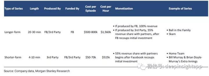过去几年Facebook产品形态的重点就是视频。事实上,视频内容的投放Facebook开始向新的模式转型。过去这种社交网站的视频内容比较适合短视频,比如这几年微博上面的几分钟短视频。这些视频有些是UGC的,也有一些PGC的。事实上,最早社交视频都是以UGC为主,大家会自己录制视频,用来传播。最早做这个模式就是Youtube,后来被Facebook收购。然而这几年,Netflix告诉了市场,头部精品剧的价值更大。视频不在于多,而在于内容制作精良。所以,Facebook最近开始通过第三方来制作质量更高的视频。根据摩根斯坦利的研究报告,Facebook自制的视频分两种: