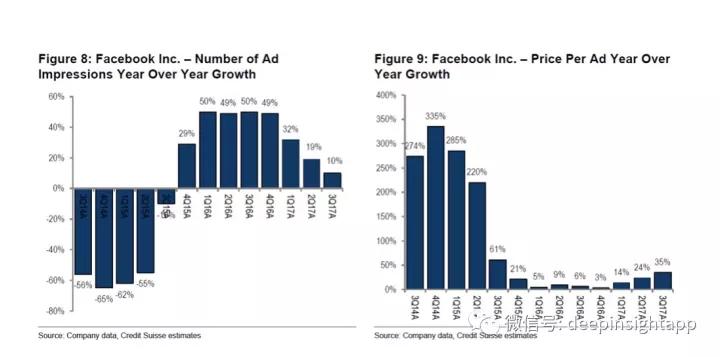 翻看Facebook最近的财报,三季度收入增长了47%至103亿美元。月活跃用户达到了20.7亿,环比增长3%,同比增长了16%。日活跃用户也达到了13.7亿,环比增长了3.2%。Facebook的日活/月活用户比例,过去三个季度一直稳定在66%。从收入结构看,Facebook基本上还是依靠广告,广告收入达到了101亿美元,几乎贡献了全部收入。随着移动端流量的爆发,广告的曝光度和价格都在增长。对于广告商来说,Facebook的用户数据越来越精准,提供了性价比最好的广告平台。而且从广告收入结构看,移动端广告收入占据了大头,占比88%。