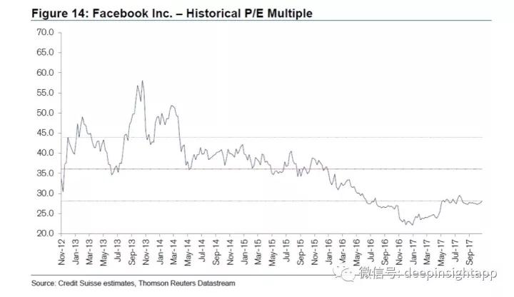 最后的最后,我们再从估值的角度看。下图我们看到Facebook目前的估值只有27倍左右,远低于历史平均的35倍。而业绩未来几年应该能维持30%以上的增长。
