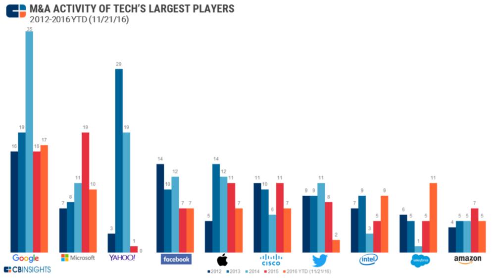 上面这张图表显示,2015年和2016年的收购数量在下降,其中Yahoo!和Twitter几乎完全停止了收购活动。然而,2017年出现了一些有趣的新趋势。