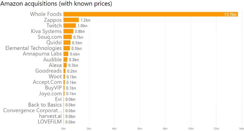 在这篇文章的开头,我们已经了解到在2012年至2016年期间,在所有的科技巨头公司中,Amazon收购的公司数量最少。