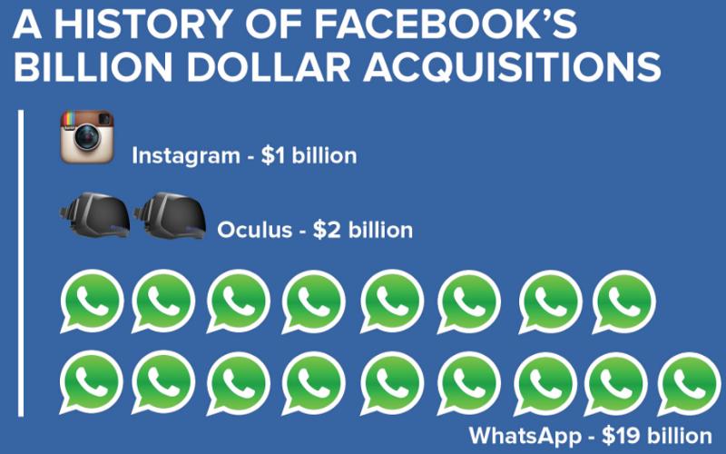 Facebook最大的一次收购是190亿美元对WhatsApp的收购。紧接着,Facebook用20亿美元将VR技术公司Oculus收入囊中,后来又以10亿美元的价格收购了非常受欢迎的社交媒体平台Instagram。