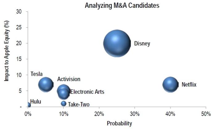 花旗在今年早些时候进行的一项研究显示,在原创内容领域,迪士尼和Netflix是最有可能被苹果收购的公司。如下图所示: