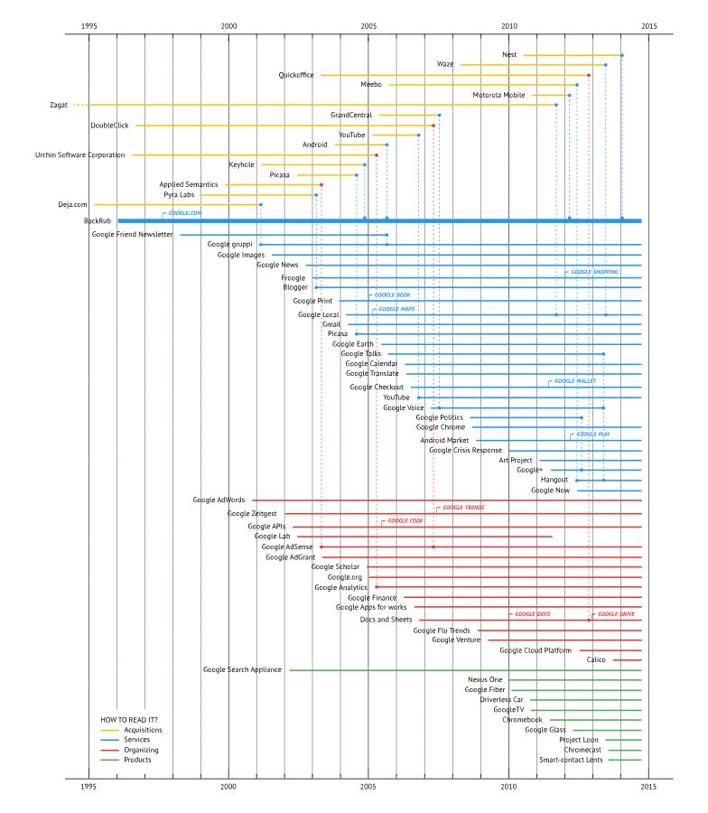 下面的图表提供了有关Google的全面收购视图,你可以从这张图中了解Google的所有这些有名的收购都是何时完成的,以及被收购的产品最终被整合进Google的哪个产品里了。