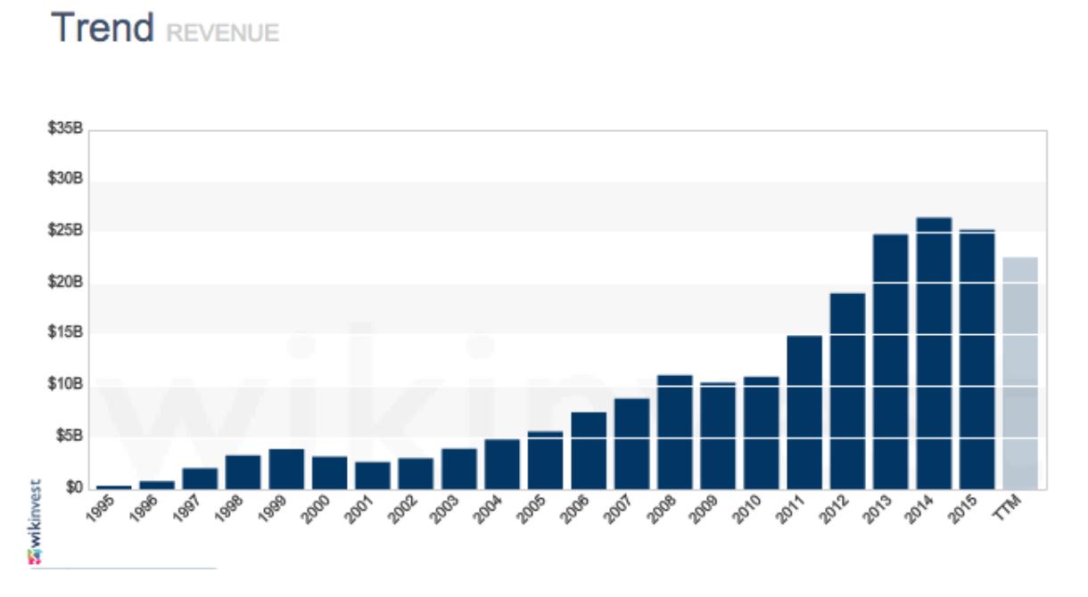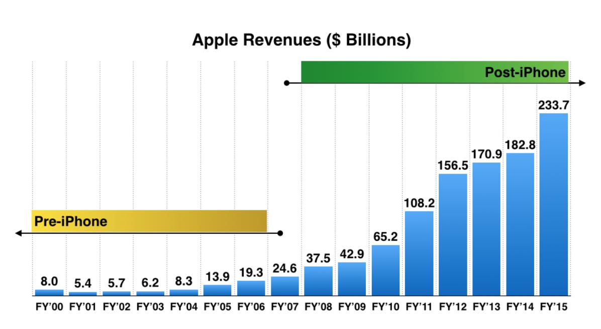 先讲机会。过去20年,大公司里抓住机会的最典型的例子就是苹果。苹果抓住了MP3(iPod)和智能手机(iPhone)的机会,苹果每财年收入从2001年最低时候的54亿美金,到2015年的2337亿美金,增长了40倍。