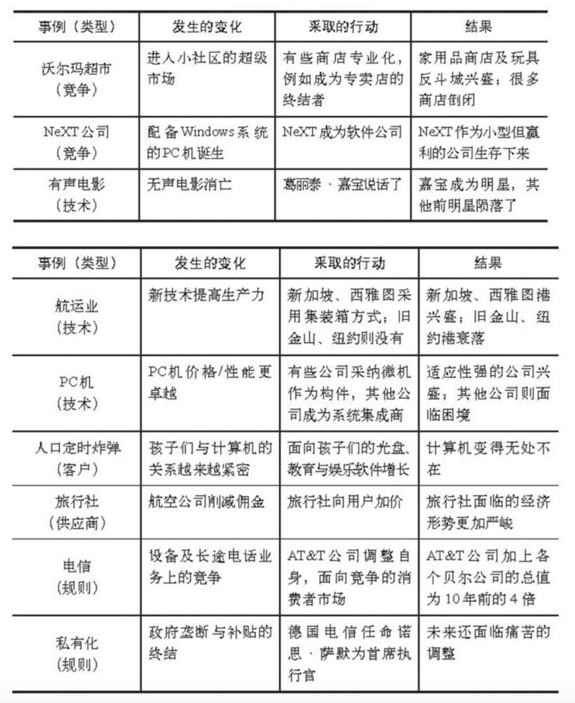 安迪·格鲁夫在《只有偏执狂才能生存》里画了一张表来演示哪些是10x变化因素,以及可能产生的结果: