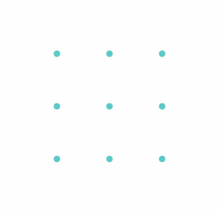 具体要求是:只用4条直线,连接下图所有的点,要求永远不会有一条直接通过任何点两次,而且你的笔不能离开纸面,需要连着划线。