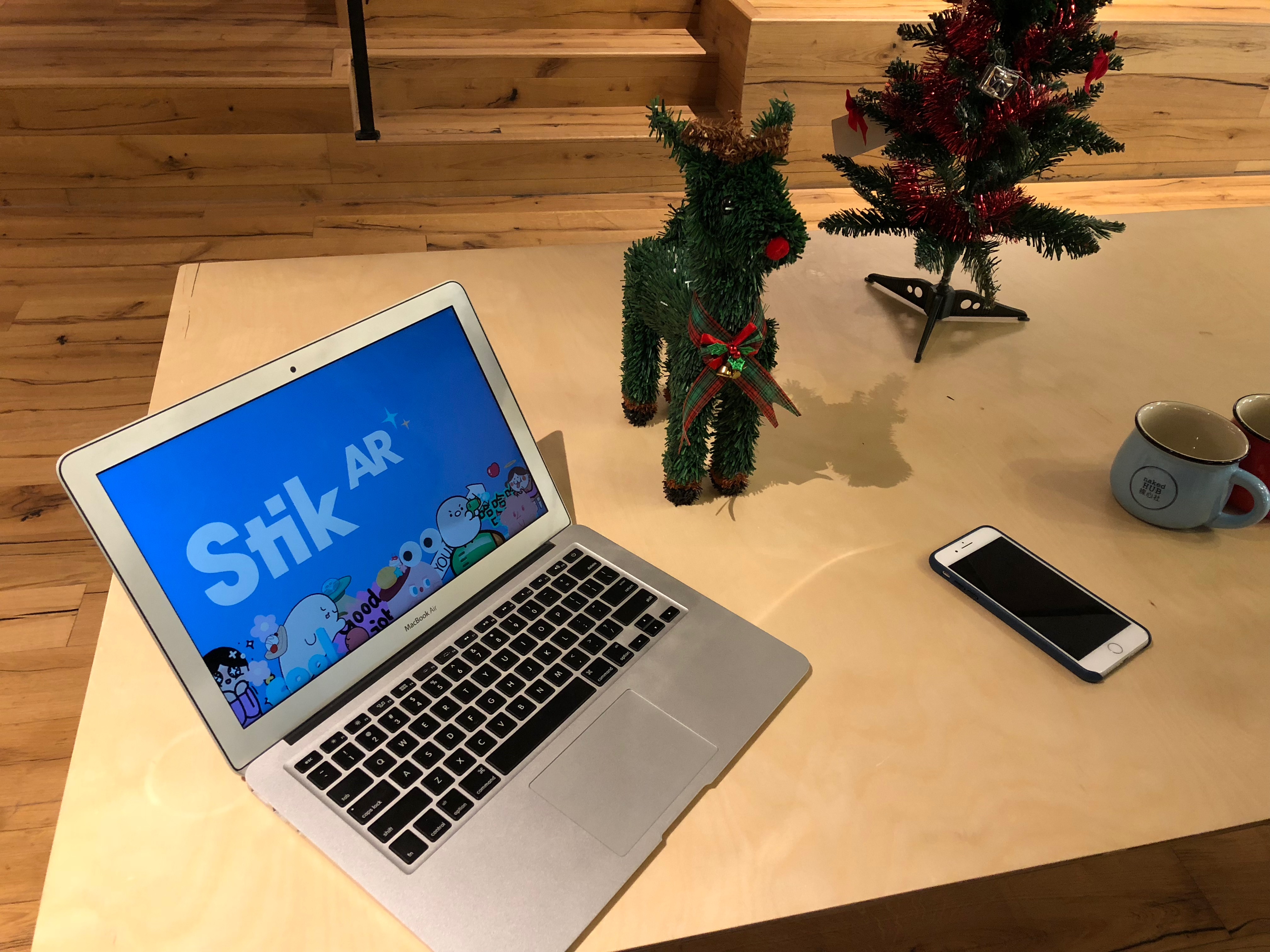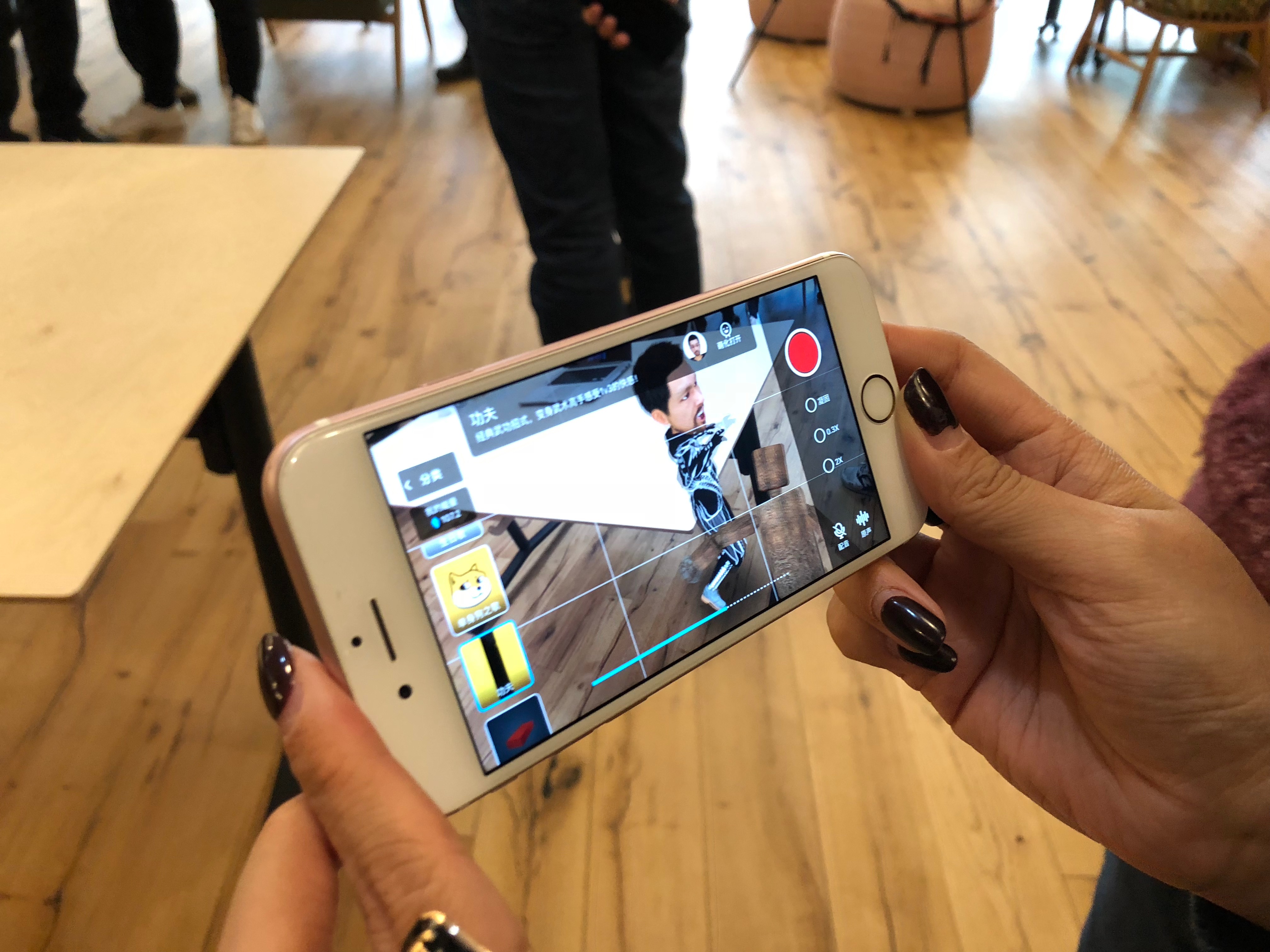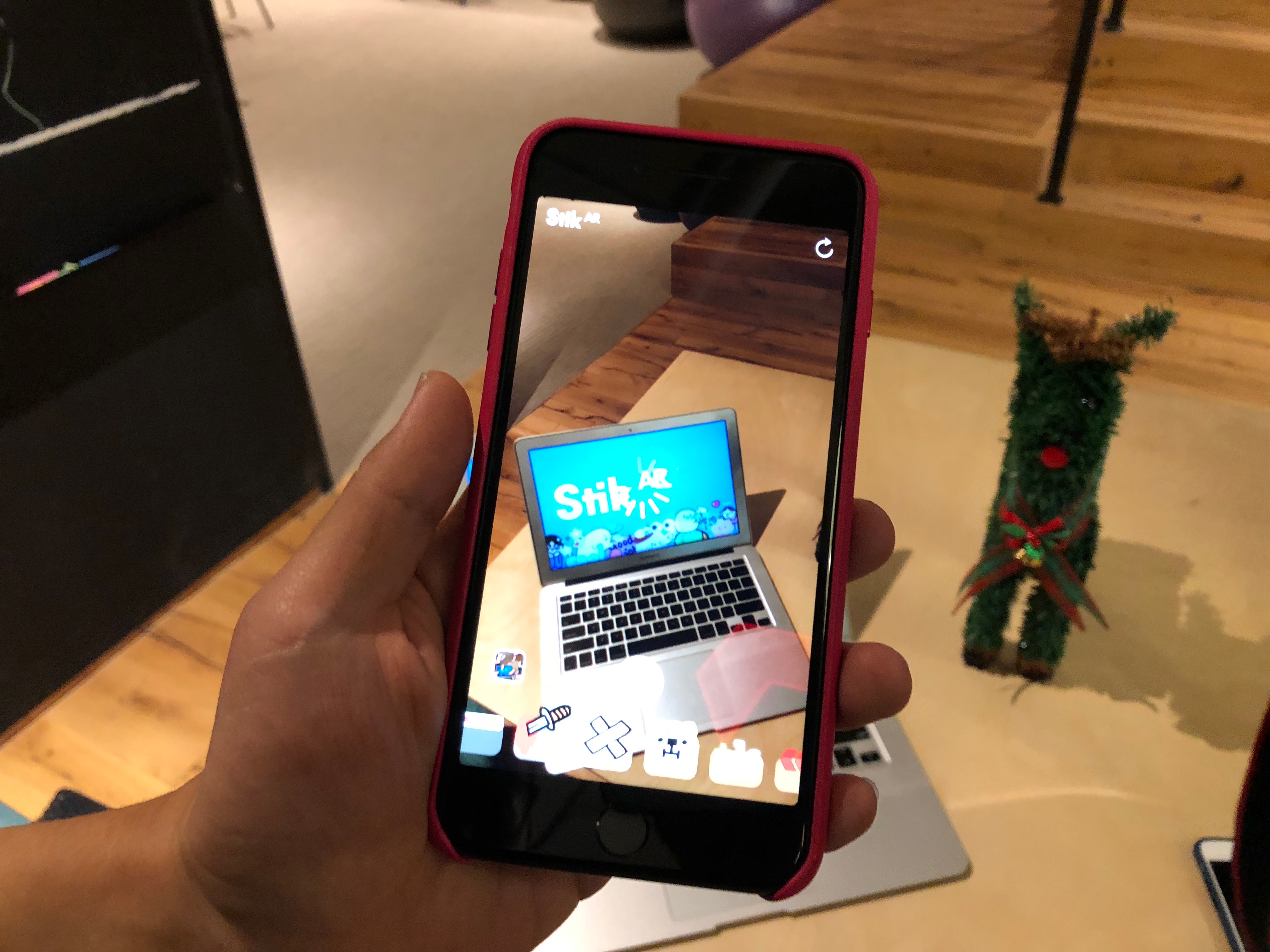 在现场体验过程中,一款叫作Stik的AR应用吸引到我们,这款应用说白了就是照片+贴纸:伸手把手机放到空中,贴纸就会固定在空中的位置,然后你可以选择拍下 GIF或者录制小视频。